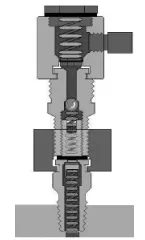 在高壓天然氣管輸系統(tǒng)中,大多數(shù)內(nèi)置止回閥無(wú)法有效防止閥門小泄漏的發(fā)生??梢韵蜷y門密封系統(tǒng)重新注入少量的清洗液(或流動(dòng)性好的潤(rùn)滑脂),浸泡一段時(shí)間后就可以有效防止這類泄漏的發(fā)生。閥門注脂嘴注入清洗液后,小球和彈簧四周固化的污物在清洗液的浸泡下,將會(huì)很快瓦解或者變軟,使止回球和彈簧得到復(fù)位,可以有效防止泄漏。如注脂嘴泄漏量大,則會(huì)導(dǎo)致注脂 操作不易實(shí)施。因此在注入清洗液前,需要安裝泄漏自鎖適配器(如圖5)。