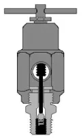 將SO-BV工具連接到注脂嘴上之前,首先逆時(shí)針旋轉(zhuǎn)SO-BV工具上的T型手柄使頂桿上行至最大位置,然后拆除密封注脂接頭上的金屬蓋帽,將SO-BV工具連接在注脂接頭的螺紋上并旋緊。然后順時(shí)針旋轉(zhuǎn)SO-BV工具上的T型手柄,頂桿下行,使得注脂接頭內(nèi)的球形止回閥“離座”,可以使得閥體內(nèi)的物質(zhì)通過(guò)泄放孔和后端的閥門被釋放出(如下頁(yè)圖7)。